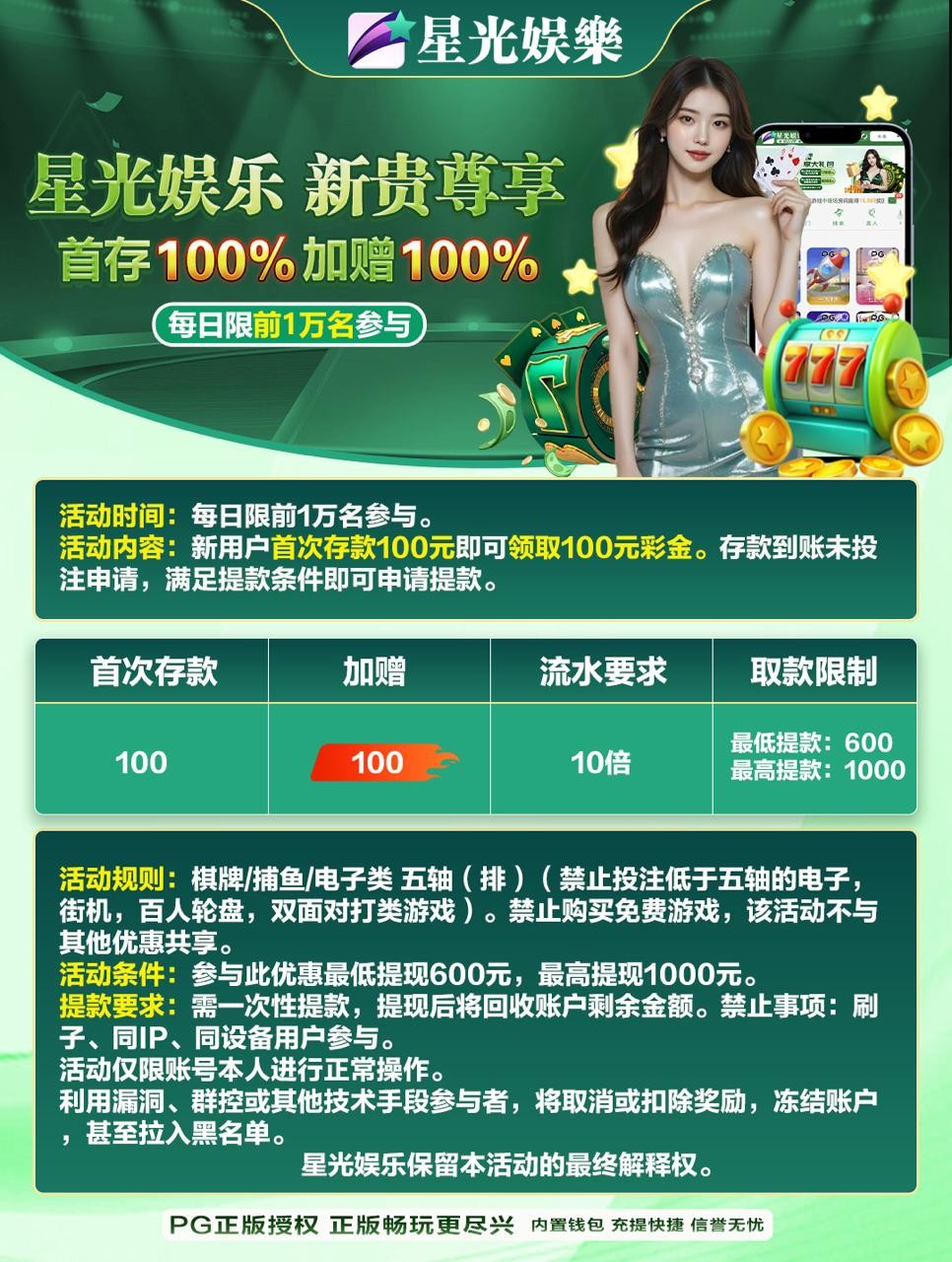 例:彩金娱乐到100,充值100完成充值的一倍100流水即可出款